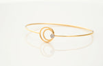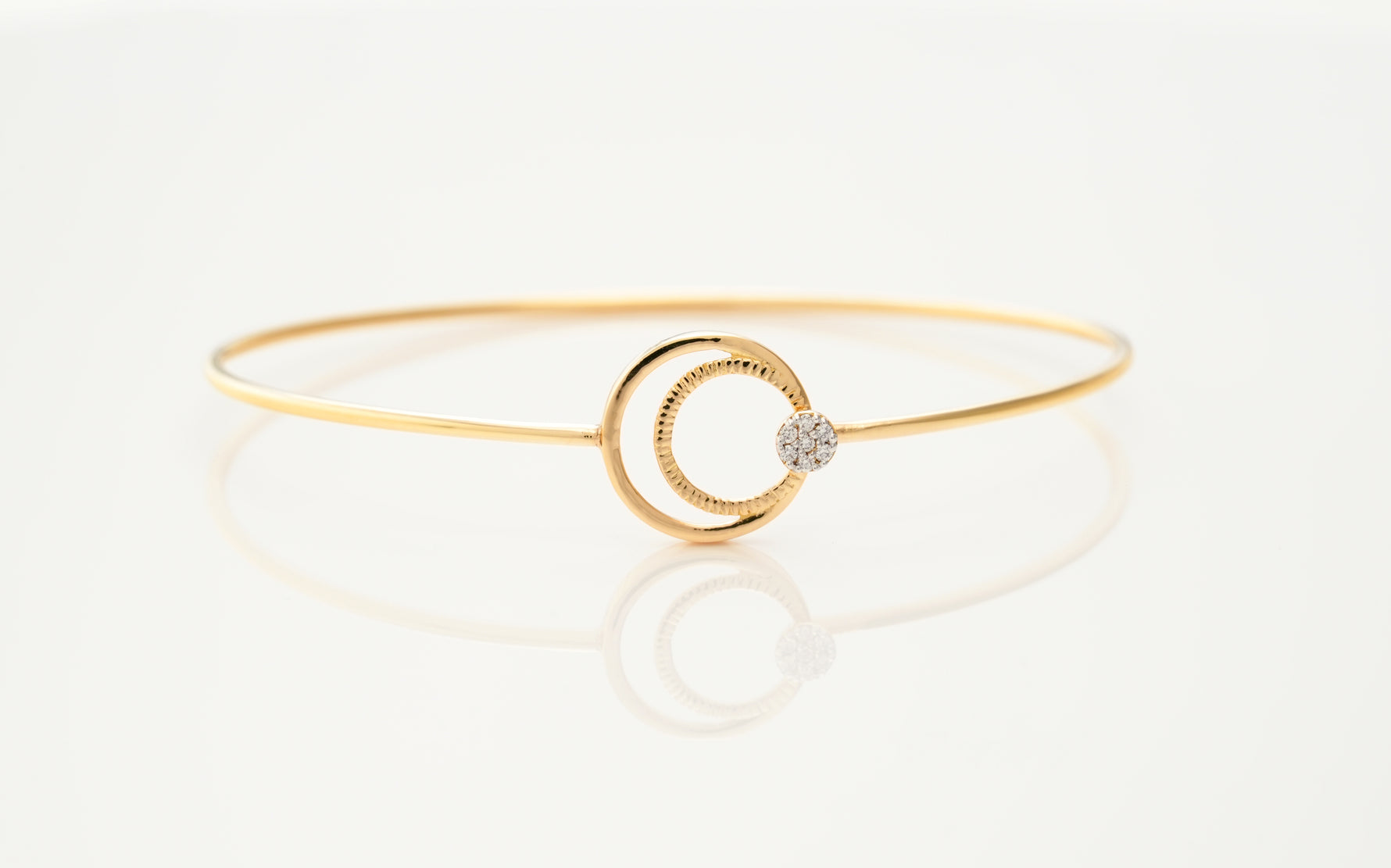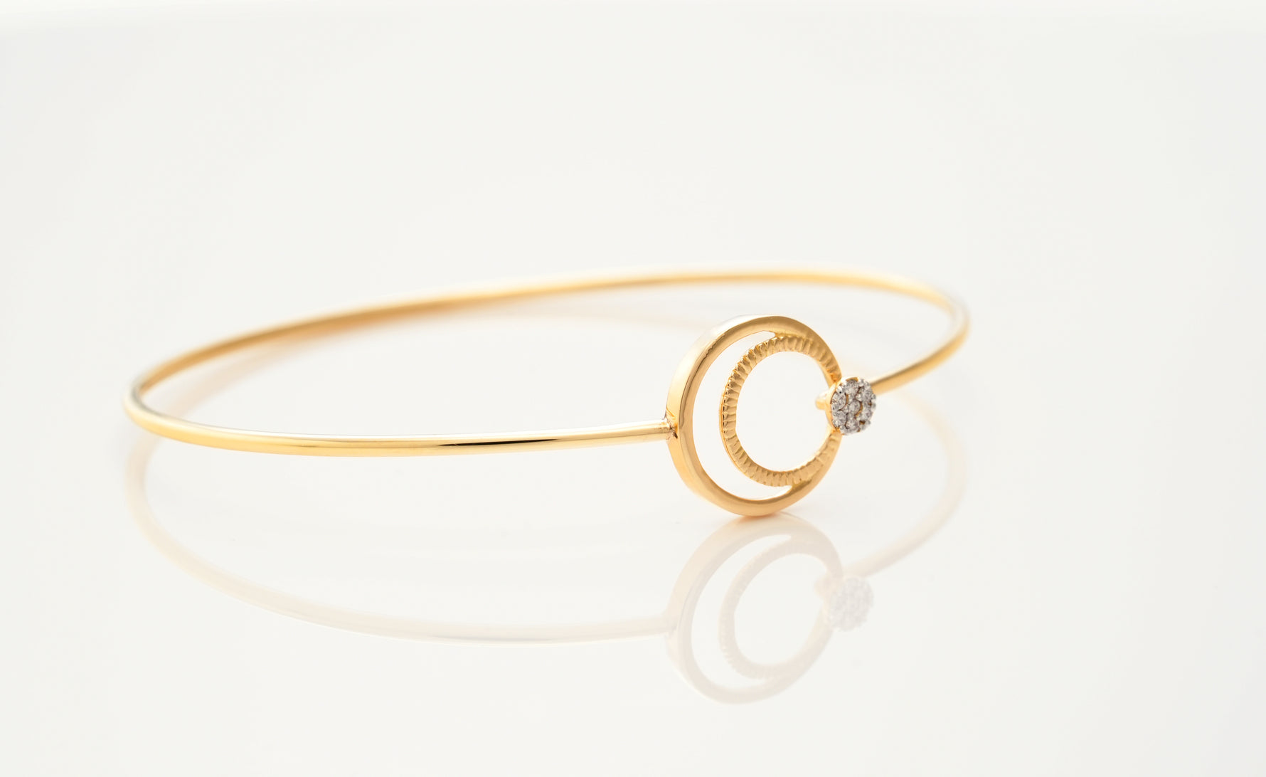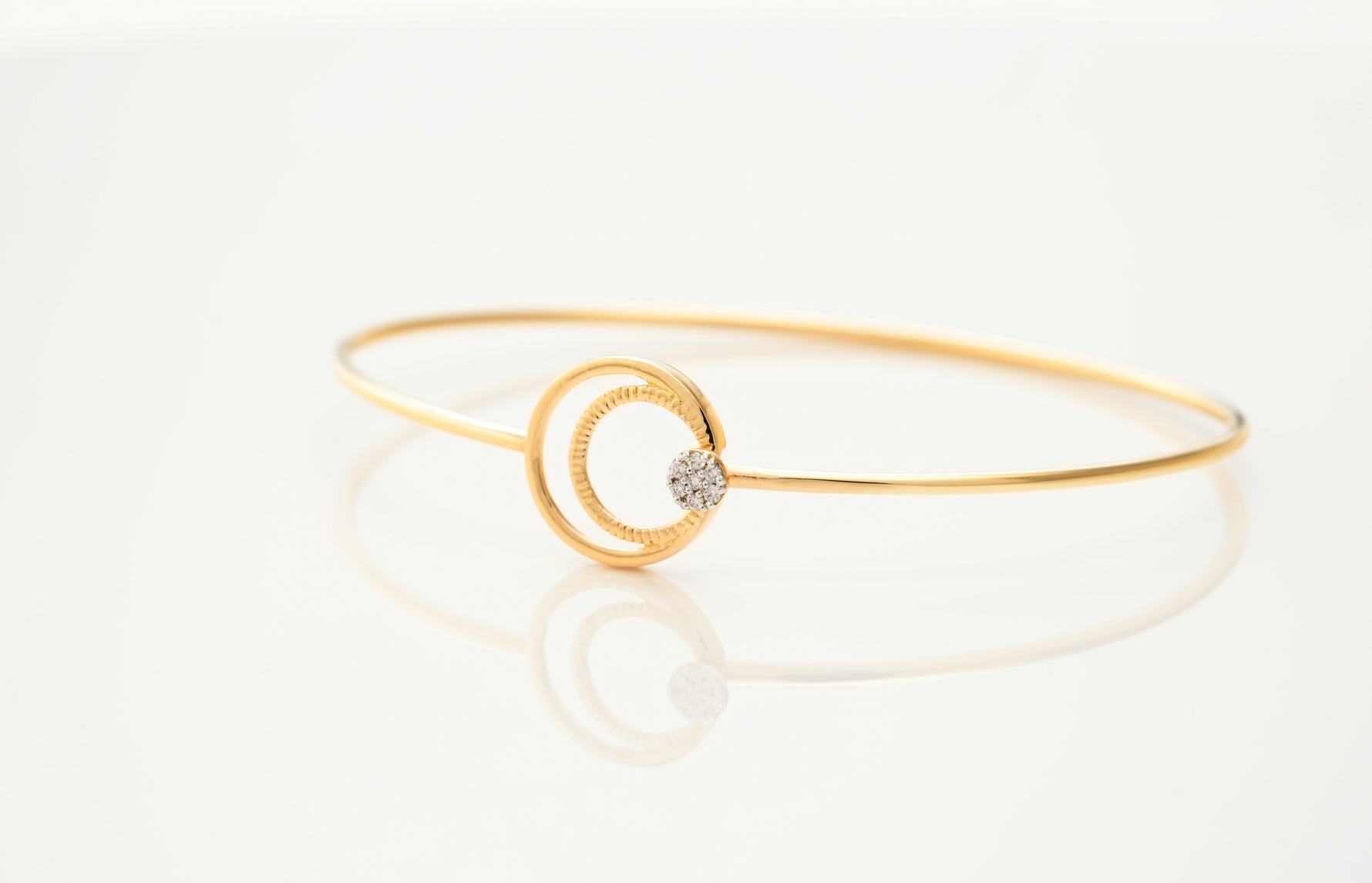 Embrace minimalist elegance with this refined yellow gold bangle, showcasing a delicate round brilliant cut diamond. The clean lines and circular motif lend a contemporary touch to this timeless piece, perfect for adding subtle sparkle to any ensemble.