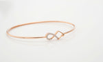 One side forms a smooth infinity loop, beautifully set with a row of sparkling diamonds, while the other side transitions into a geometric diamond-shaped frame with a pointed arrow-like tip. The fusion of curves and sharp angles gives it both elegance and strength.